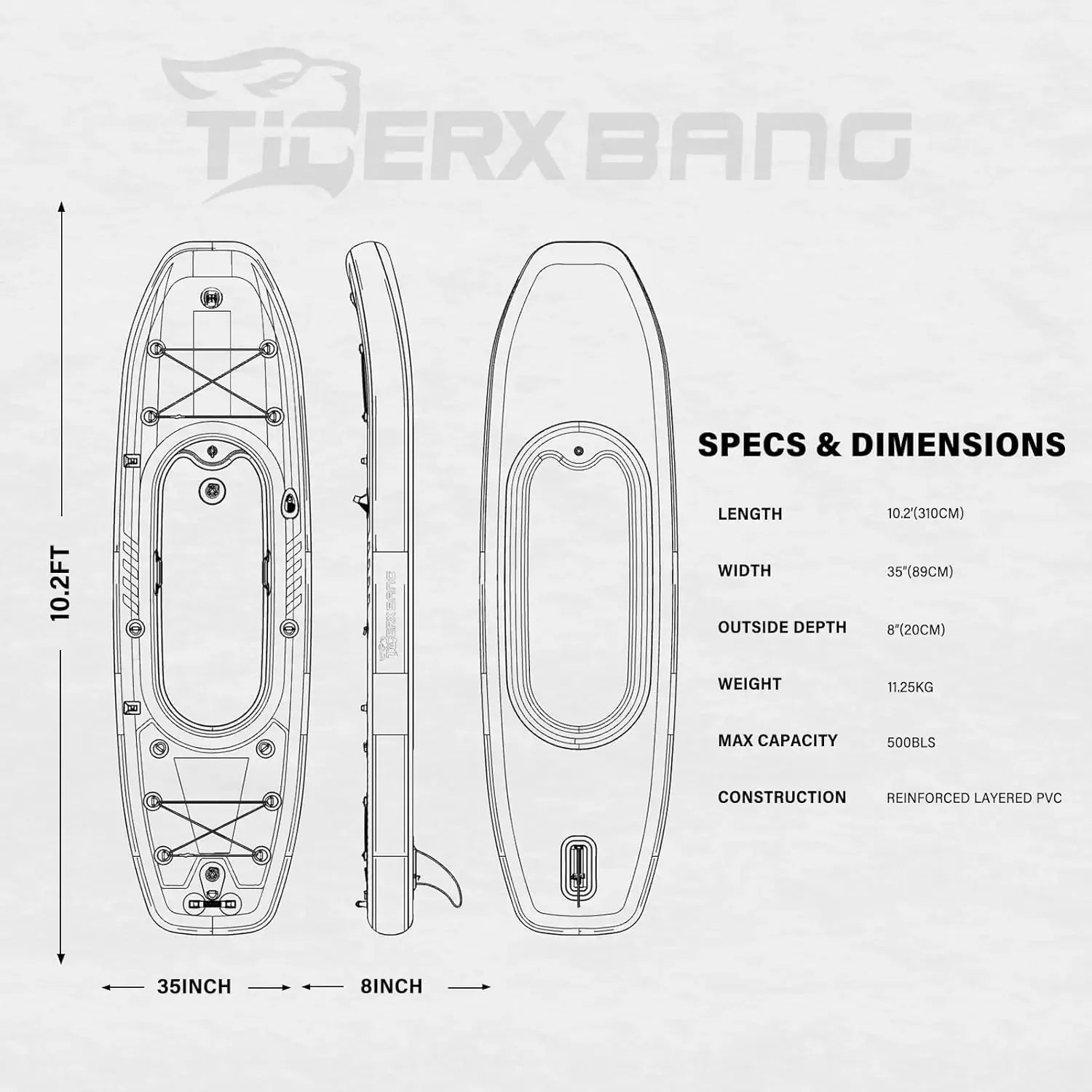 - Portable Design: Tigerxbang Inflatable kayak has baggage straps on the bow and stern to store backpacks and other items; a paddle holder on the side for easy carrying the paddle into the water with the kayak boat, or fishing on the fish rod holder to enrich your touring life.