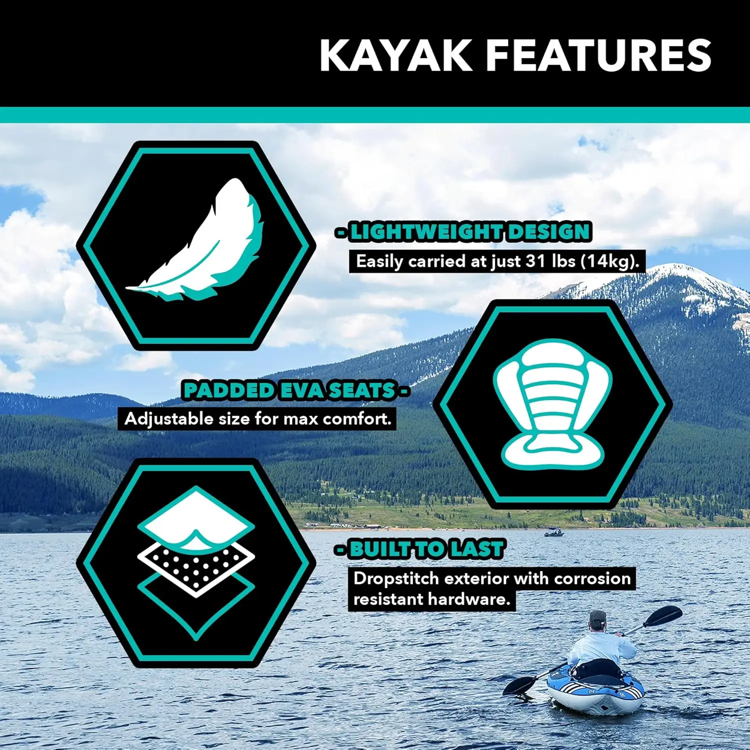 - PACKAGE INCLUDES - Inflatable Kayak, Adjustable EVA Padded Seat with High Back Support, Dual Blade Kayak Paddle, Deluxe Dual Action Pump, Quick-release fin, and a Travel Bag.