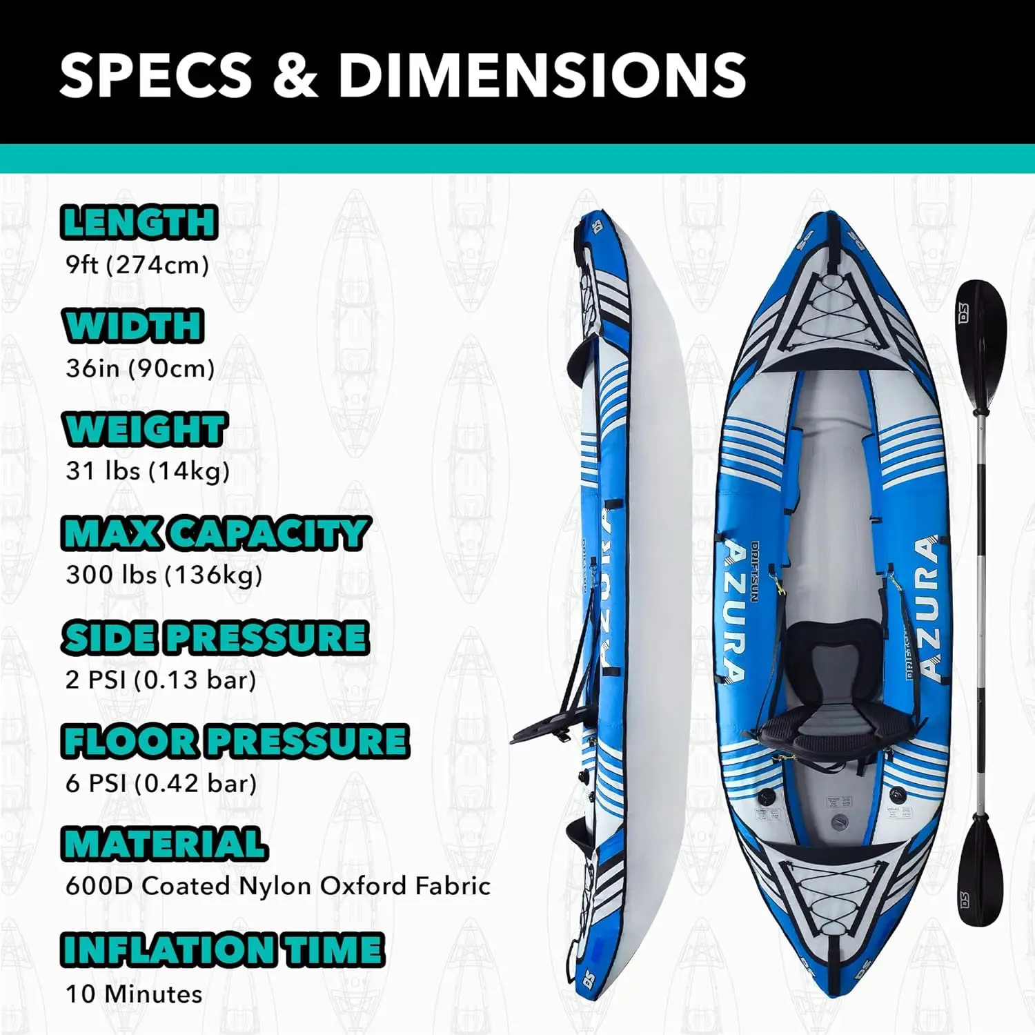 - KAYAK SPECIFICATIONS - Exterior: 9’(L) x 36”(W) / Weight: 31 Lbs. / Capacity: 300 Lbs. 1 Adult, Gear, or a Furry Friend / Inflation Time: 10 Mins. / Inflation Pressure: 2 PSI Side Tubes & 6 PSI Floor.