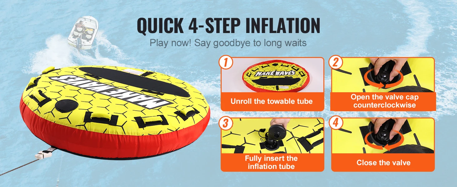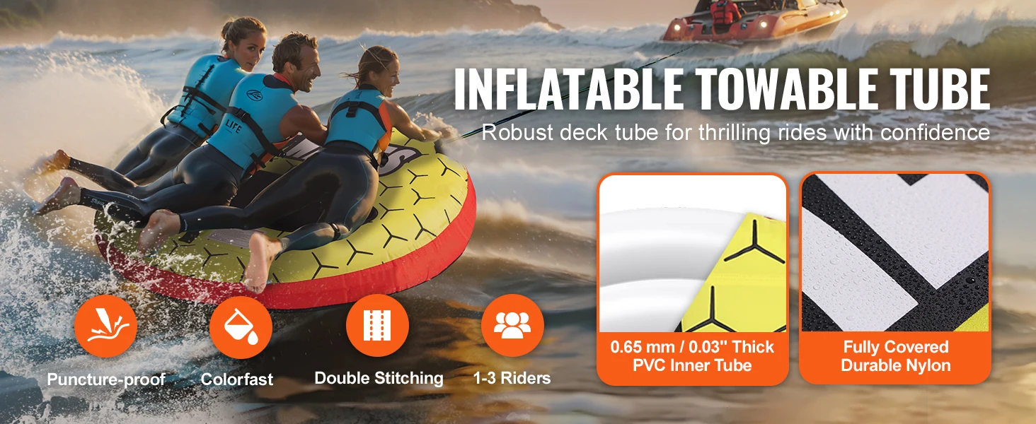 Durable & Resistant Materials: Our boat tubes and towables are covered with robust nylon, featuring 840D nylon on the bottom and periphery and 420D nylon on the back, providing superior UV protection and resistance to aging. (PLEASE NOTE: 1. After use, please deflate the product and store it. 2. Avoid prolonged exposure to direct sunlight, as it may lead to bursting and cracking.)