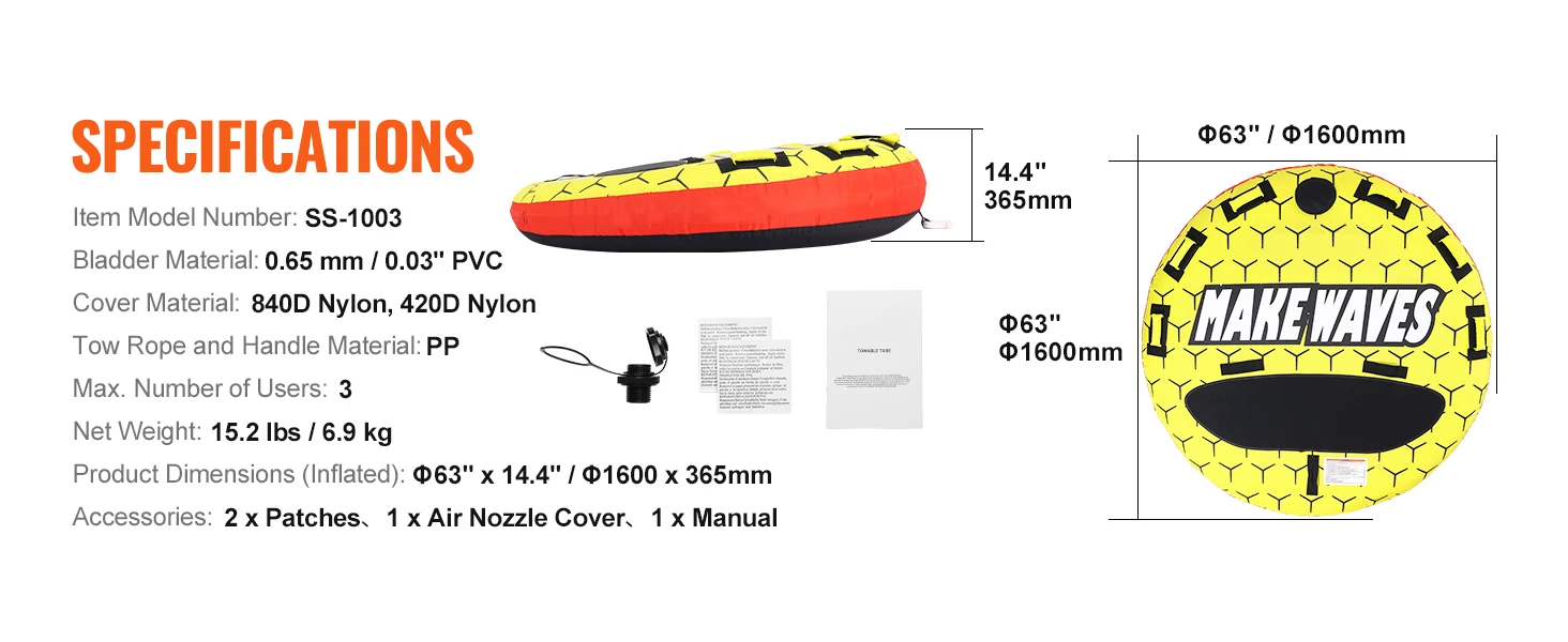 Spacious for Two Riders: With a maximum load capacity of 510 lbs / 231 kg, our Φ63.0" / 1600 mm inflatable towable tube comfortably accommodates 1-3 riders. The ultra-wide seat design ensures stability and balance, making it an ideal choice for adults, kids, couples, friends, or family looking to share a thrilling surfing adventure.